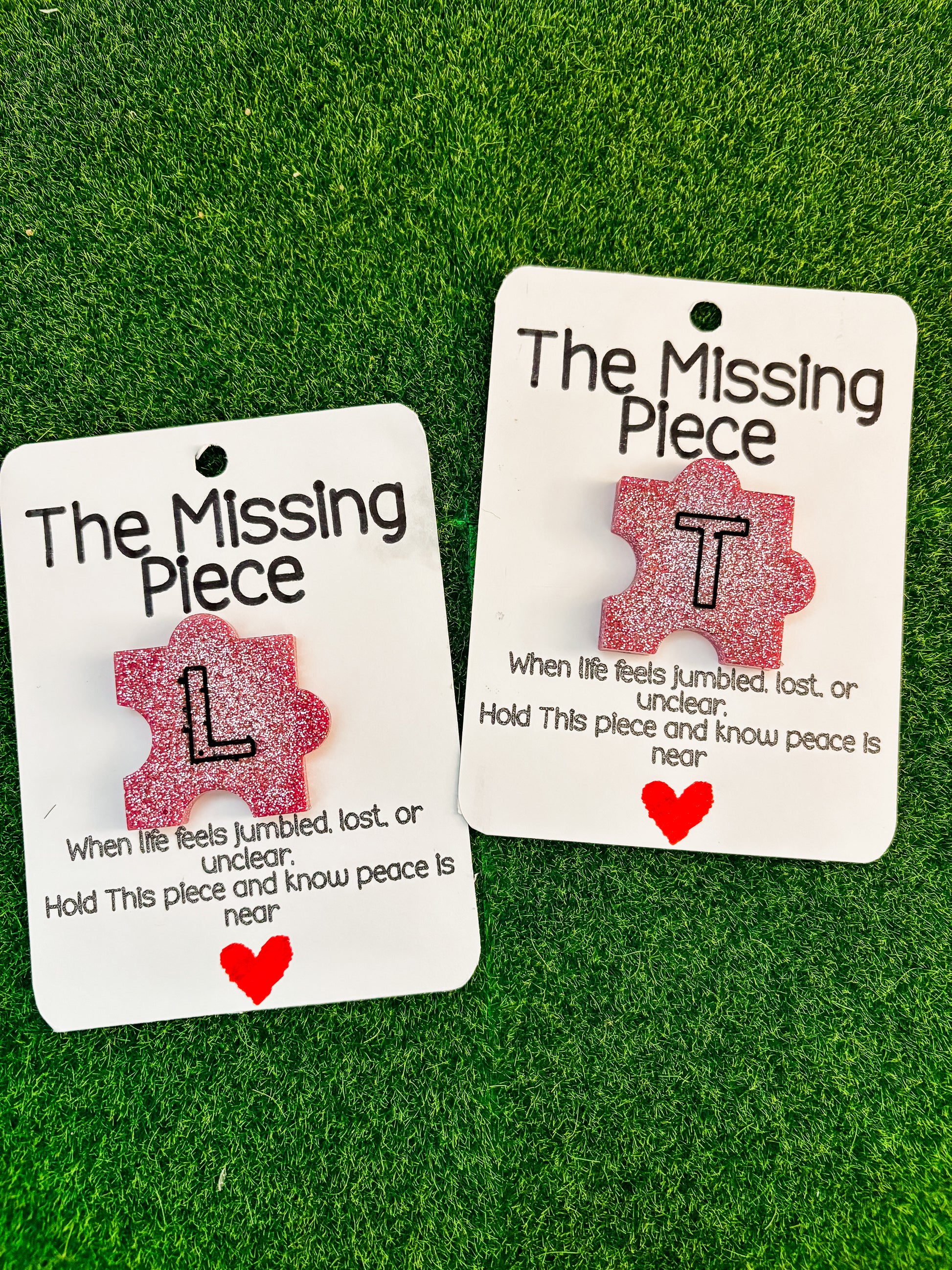 Each resin puzzle piece—featuring Letters—is mounted on a 3" x 4" card with a comforting message: when you’re feeling lost or out of place, take a breath—your missing piece is right here.
